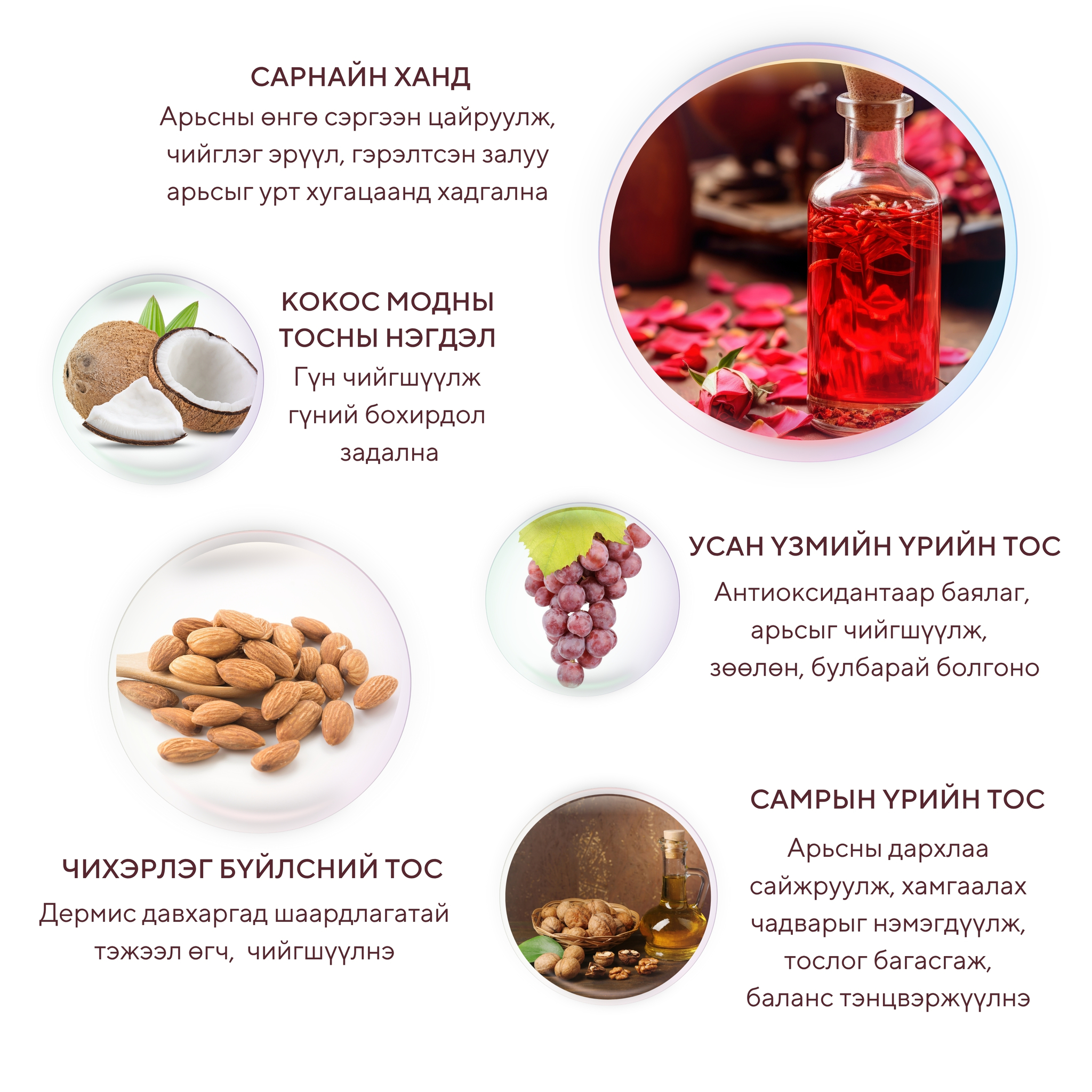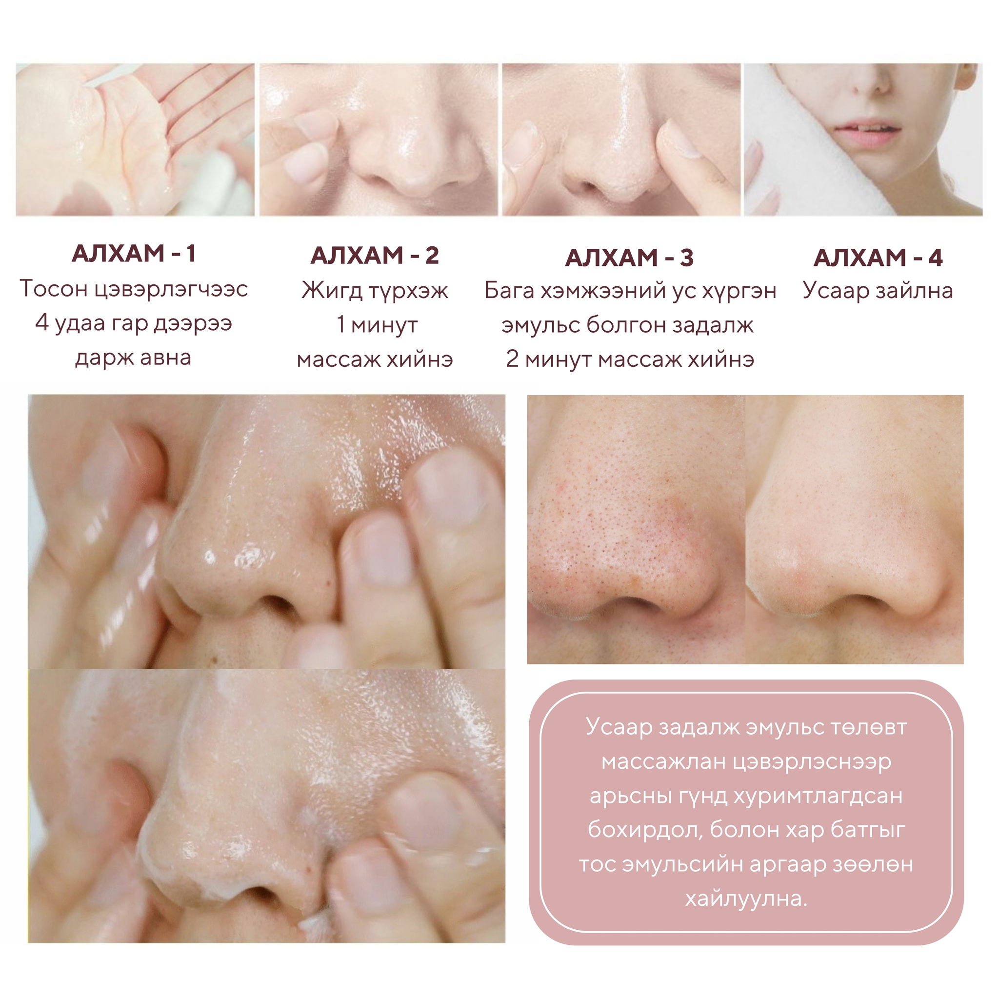 Будаг, нарны тос, арьсны тослог, үхэжсэн эд эсийн үлдэгдэл гэх мэт арьсны нүх сүвэнд байж болох бүх бохирдлыг хайлуулан цэвэрлэж, арьсны өнгө цайруулж чийгшүүлнэ