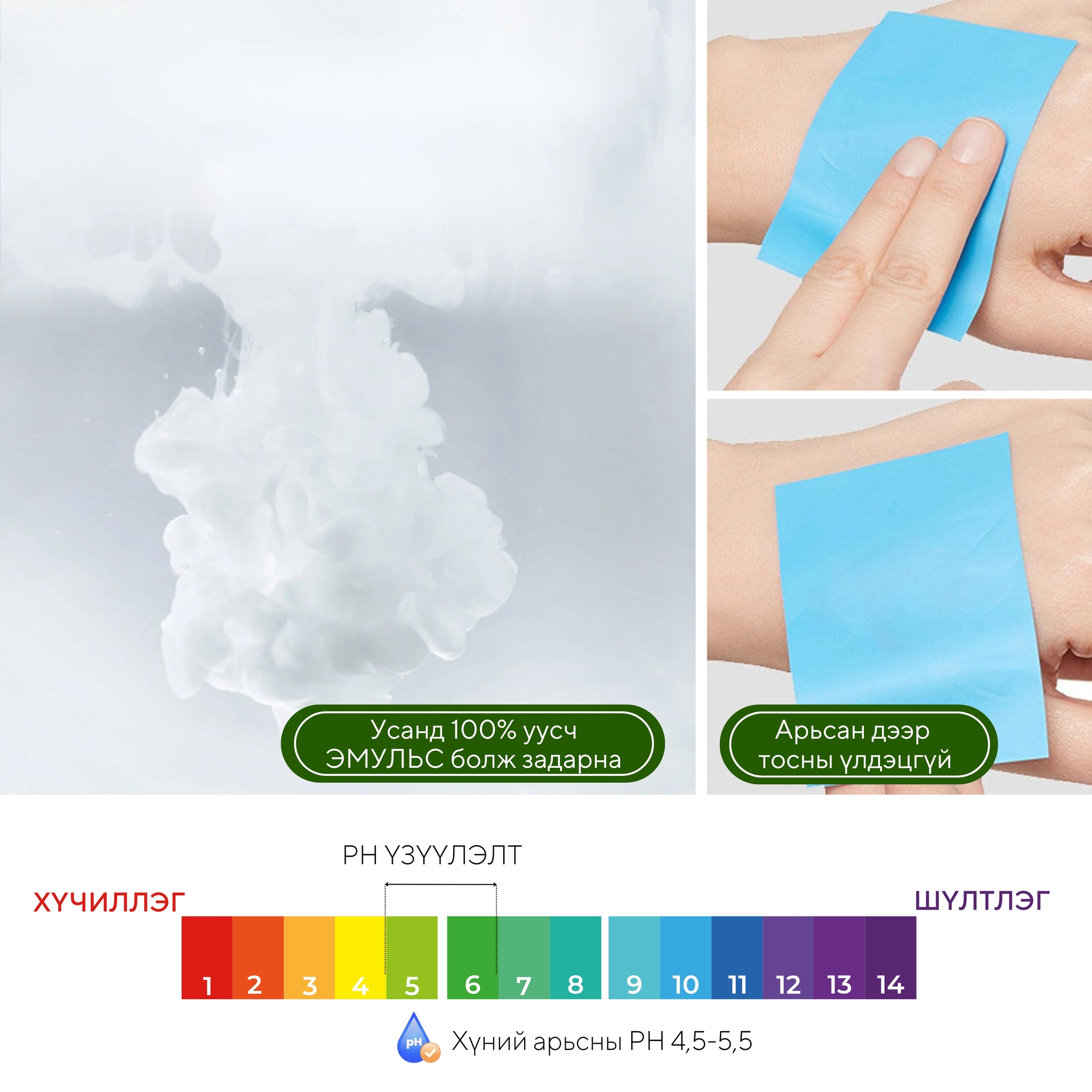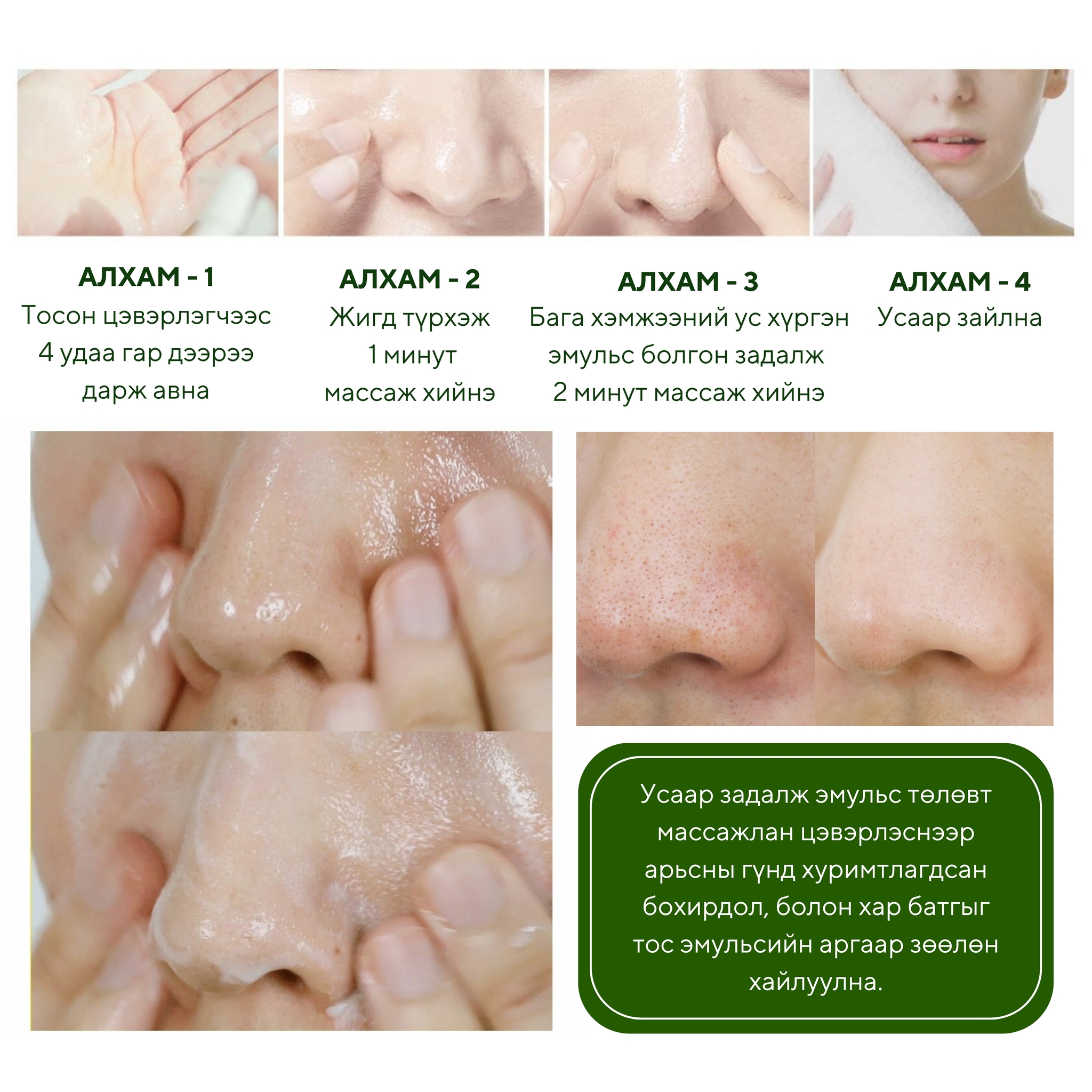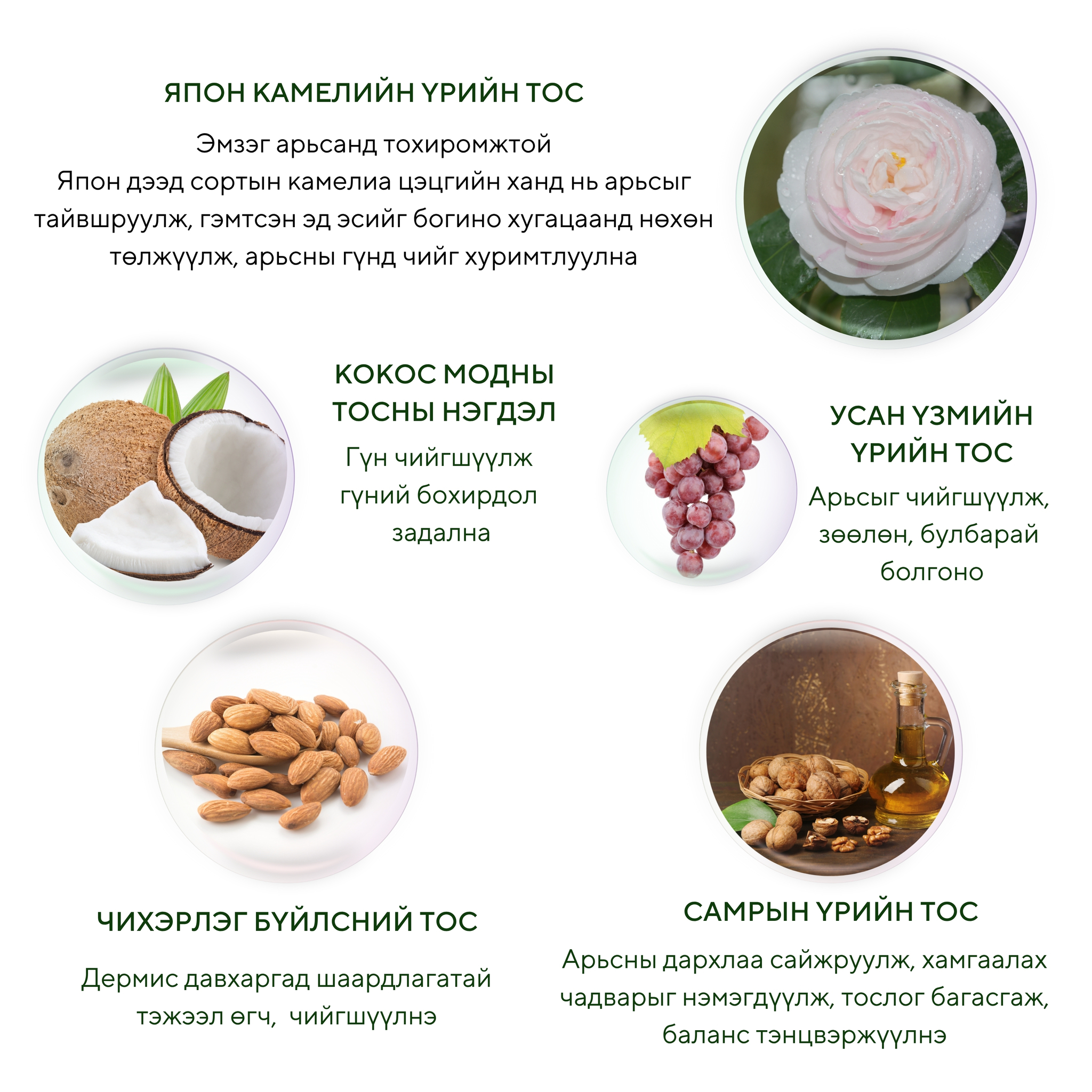 Будаг, нарны тос, арьсны тослог, үхэжсэн эд эсийн үлдэгдэл гэх мэт арьсны нүх сүвэнд байж болох бүх бохирдлыг хайлуулан цэвэрлэж, арьсны эмзэгшил багасгаж чийгшүүлнэ