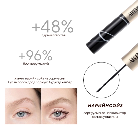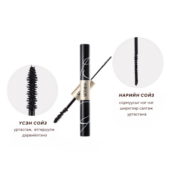 Үсэн хошуутай тул сормуусыг уртасгаж, өтгөрүүлж, бэхжүүлнэ. Жижиг талаар доод сормуусаа будахад хялбар