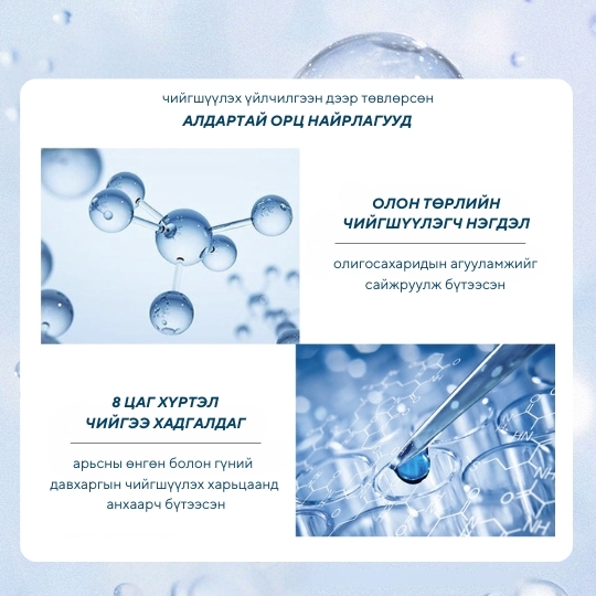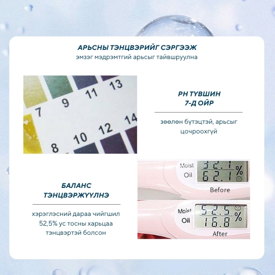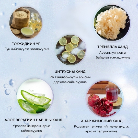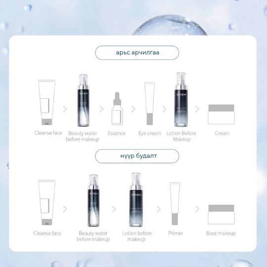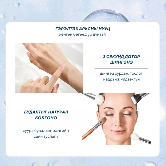 Нүүр будалтын өмнө шаардлагатай шим тэжээл чийгийг нөхөж төгс суурийг хормын төдийд бүтээж өдрийн турш чийглэг байлгана Нүүр будалтын өмнө арьсны ус тосыг тэнцвэржүүлэн бэлдэж, арьсын бүх арзайлтыг дарж, гүн чийг тэжээлээр хангана