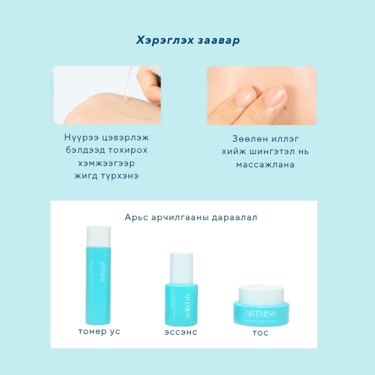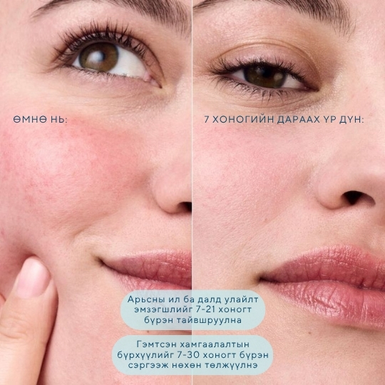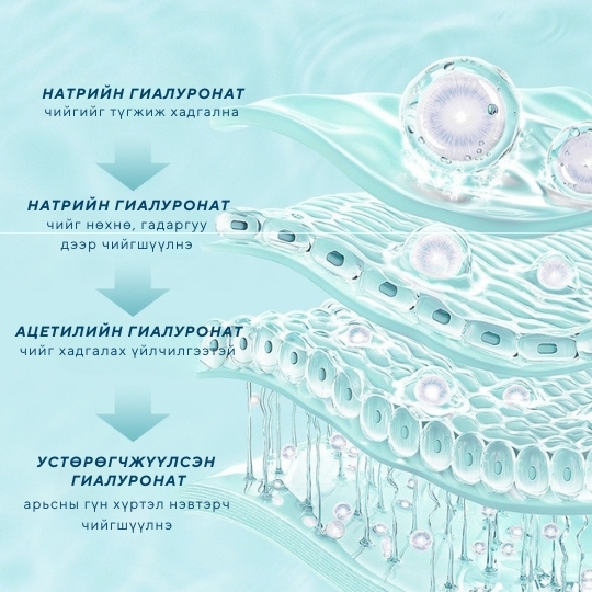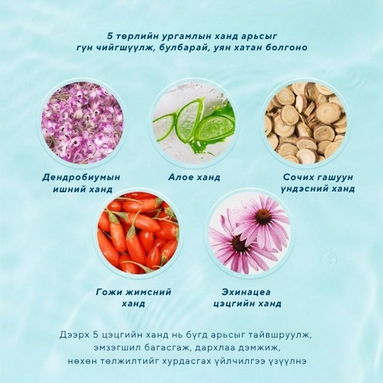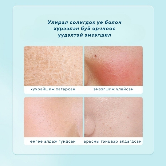 Арьсны баланс тэнцвэржүүлж, өнгө жигдэлж цайруулан, арьс тайвшруулж, улайлт эмзэгшил багасган усан чийгээр хангана Арьсны үрэвсэл эмзэгшил намдааж, арьсны хамгаалалтын бүрхүүлийг нөхөн сэргээж, арьс тайвшруулна Арьсны хамгаалалтын бүрхүүлийн нөхөн төлжүүлж, нүх сүв бөглөхгүйгээр тэжээлээр ханган арьс тайвшруулна