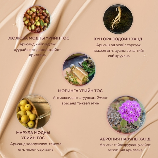 Хятад хүн орхоодой агуулсан крем нь арьсны эд эсийг нөхөн сэргээж, 12 цагийн турш арьсан дээр хөдөлгөөнгүй тогтож гүн чийгшил тэжээл өгнө