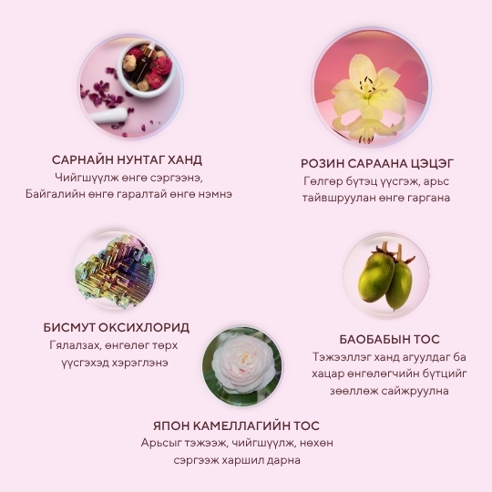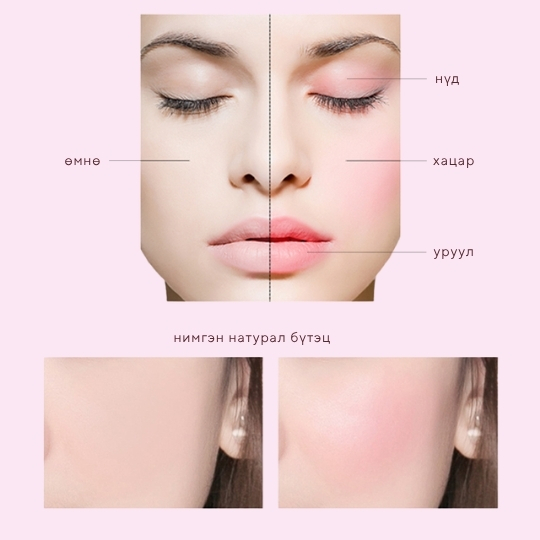 Байгалийн натурал өнгийн гаралт нь нүүрний зөв хэлбэрийг тодотгож, арьсыг гэрэлтсэн, эрүүл, залуулаг харагдуулна