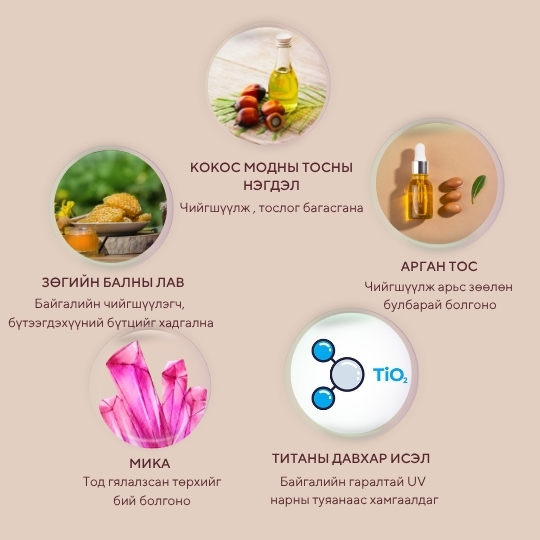 Хялгасан үрчлээ тэнийлгэж арьсыг чийглэг, гялалзсан, эрүүл харагдуулж нүүрний онцлох хэсгүүдийг тодотгоно