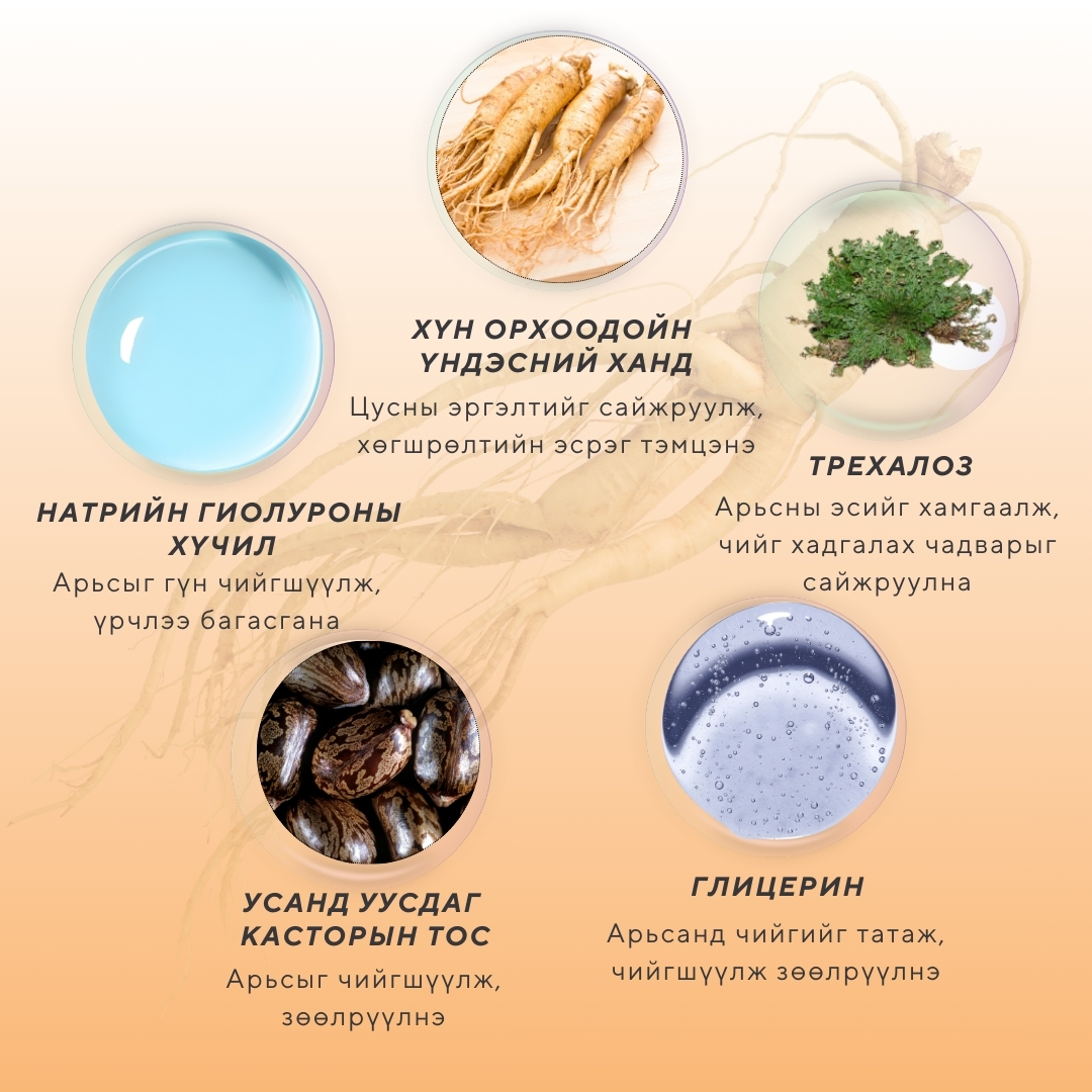 Арьсны нөхөн сэргээлт хийж, гүн чийг тэжээлээр хангаж, хөгшрөлт үрчлээний эсрэг үйлчилгээ үзүүлнэ Арьсны хуурайшилт зогсоож, уян хатан байдлыг сэргээж, хялгасан үрчлээ тэнийлгэж, өнгө засаж, нарны нөлөөг багасгана Арьсыг тайвшруулж, үрэвсэл намдаан, сэвх нөсөө толбо багасган хөгшрөх процессыг саармагжуулна