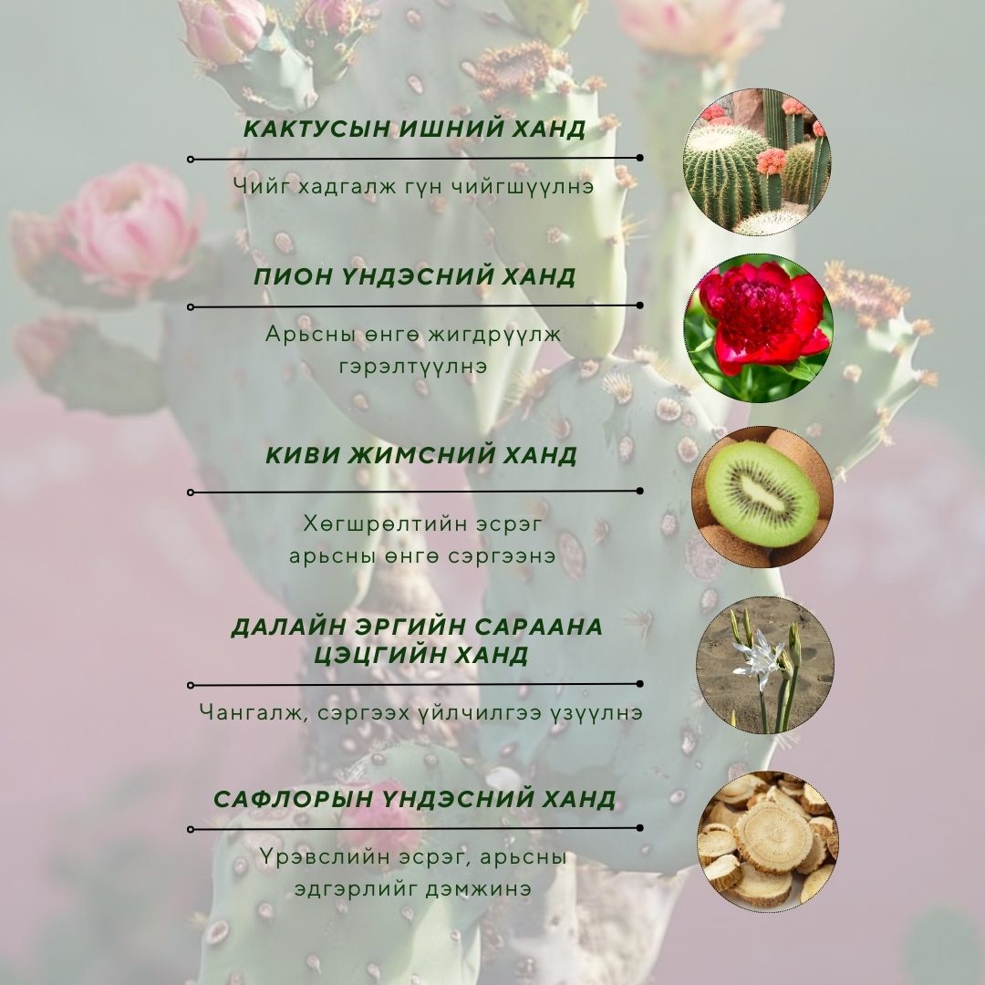 Эмзэг мэдрэг арьсыг тайвшруулж, арьсны хамгаалах давхаргыг бэхжүүлж, үрэвсэл намдаан гүн чийгшүүлнэ Арьсыг гэрэлтсэн, жигд өнгөтэй болгож нөхөн төлжүүлж, гүн чийгшүүлнэ. Анти-оксидант хамгаалалт хийж хөгшрөлтөөс сэргийлнэ Арьсны бүтцийг зөөлрүүлж, гэрэлтсэн толигор болгон, ус барих чадварыг сайжруулж, тайвшруулах үйлчилгээ үзүүлнэ Арьсыг гүн чийгшүүлж, ширүүн барзгар бүтцийг сайжруулж, эсийг нөхөн сэргээж, чийгийн түвшинг тэнцвэржүүлнэ