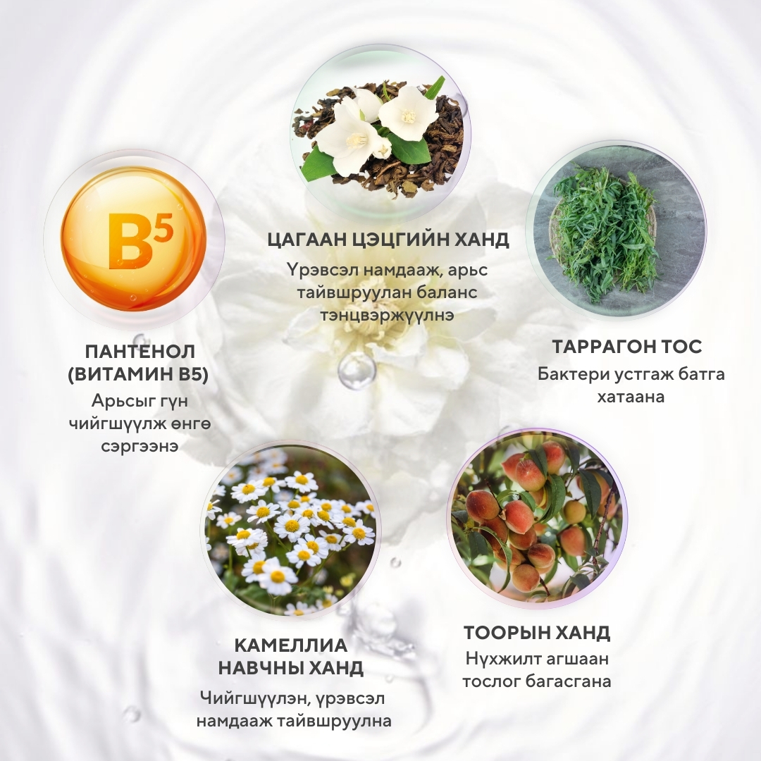 Арьсанд хуурайшилт үүсгэхгүй илүүдэл тослог бохирдлыг цэвэрлэн, батга хатааж үрэвсэл намдаана Арьсны гүнд хүртэл нэвтэрч ус тосны баланс тэнцвэржүүлэн нүхжилт агшааж, дараагийн бүтээгдэхүүн хүлээж авахад бэлдэнэ Идэвхт найрлага бүхий эрчимжүүлсэн ийлдэс нь богино хугацаанд тослог багасган, нүхжилт агшааж, батга үрэвсэл намдааж, гүн чийгшүүлнэ Молекул бөмбөлгөн коллаген агуулсан тос нь усан чийгийг арьсны гүн рүү нэвтрүүлж, батга эмчилж, үрэвсэл арилган, ус тосны баланс тэнцвэржүүлнэ